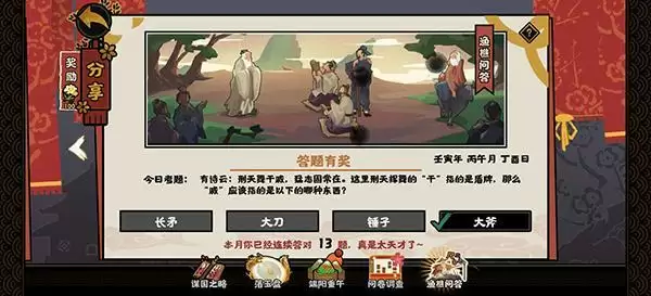 2022无悔华夏渔樵问答6月13日答案是什么,今日考题问刑天舞干戚中的“戚”值得是什么物品,可能有很多玩家对于这个答案不是很清楚,下面就一起来看下正确的答案吧。