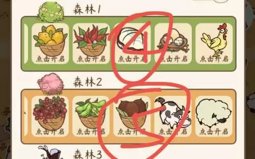 2、按照下面的图进行一一找齐就可以啦,只要找到之后哒哒自己就会换张地图,一二三一二,森林一到桃树结束,去森林二;森林二到棉花结束,去森林三;森林三结束去森林一,然后二。