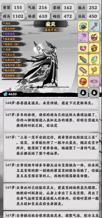 3.统治开局(因为需要家境)开局最好是七色葫芦(刷新买东西半价)其次体质修为(看广告拿的金的体质修为和混元乾坤扇更好,好过七色葫芦)再其次是魅力智慧双抗。