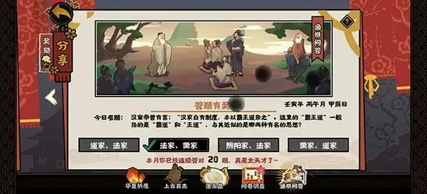 2022无悔华夏渔樵问答6月20日答案是什么,今日考题问的是在汉宣帝时期,有“霸道”和“王道”两种思想,与其近似的两种有名思想分别是什么,正确答案是法家、儒家,下面一起来看下具体的问答内容。