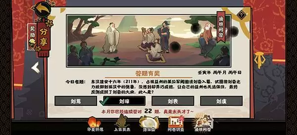 2022无悔华夏渔樵问答6月22日答案是什么,今日考题问的是在东汉建安十六年(211年),益州的某位军阀想要借助刘备的力量抵御张鲁,最后反而帮助刘备成就大业的人是谁,正确答案是刘璋,一起来看下具体攻略内容。