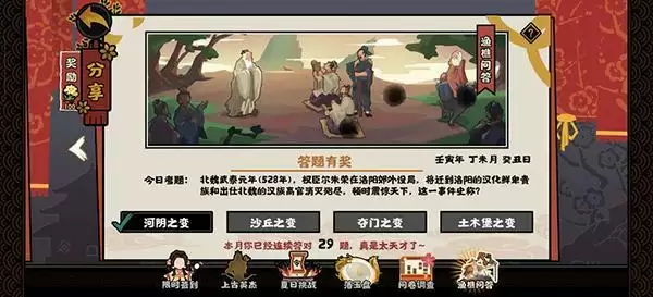 2022无悔华夏渔樵问答6月29日答案是什么,今日考题问的在北魏武泰元年(528年),权臣尔朱荣设局将鲜卑贵族和汉族高官消灭殆尽,这次事件被称为什么,正确答案是河阴之变,下面就一起来看下具体攻略内容。