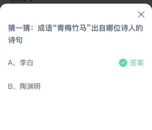 小鸡宝宝考考你成语青梅竹马出自哪位诗人的诗句,支付宝小鸡庄园5月20日正确的答题答案是什么,有很多小伙伴可能想知道蚂蚁庄园免费小鸡饲料成语青梅竹马出自哪位诗人的诗句问题的答案,那下面就一起来看看5月20日小鸡宝宝考考你成语青梅竹马出自哪位诗人的诗句小鸡正确的答案领取饲料吧。