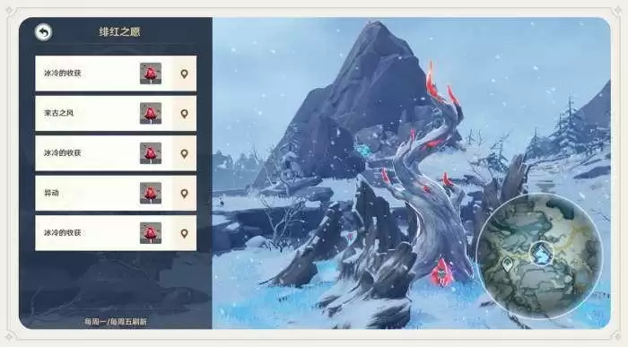 雪山地图上分布的绯红玉髓只能让「忍冬之树」升到8级,但忍冬之树总共有12级,剩下的绯红玉髓需要通过达成“绯红之愿”任务才能获取。