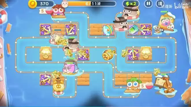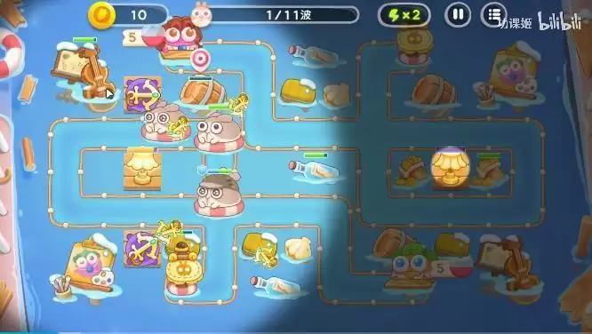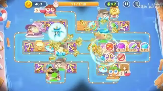 2、来到中期我们除了在左边布局更多的船锚炮之后还需要在右边布局一些鱼雷炮和冰冻炮之粗的;