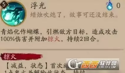 2、浮光:普攻技能,满级伤害120%,攻击时 必定附带“掠火”减益状态。普攻升级只有伤害提升,可以不升级。