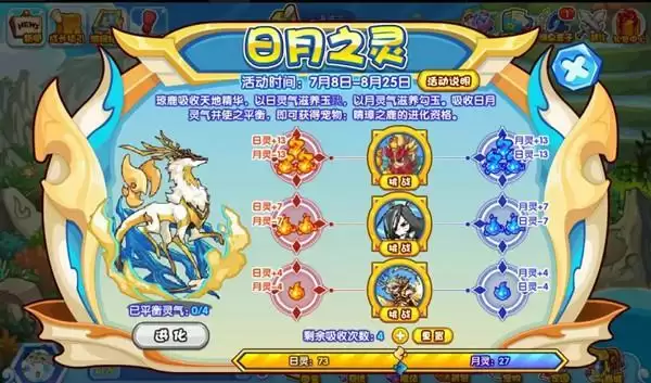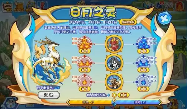 与BOSS战斗,胜利即可获得选择吸收灵气的机会,在有限的“剩余吸收次数”中将日/月灵分别稳定在50即可平衡灵气,此活动需要提前计算好,如何对日/月灵进行加减以实现在有限次数达到平衡,若无法在规定次数中达到平衡,可通过重置重新吸收,但在3分钟中不可进行挑战