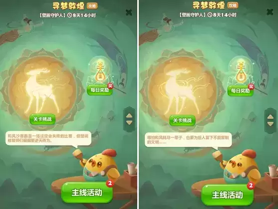 除了主线活动,消消乐也结合了敦煌文化中“画、舞、乐、史”的特点,设置了灵鹿复苏、舞乐飞天、天音绕梁、丝绸之路4个主题活动关卡,在消除玩法的基础上,融入不同的敦煌元素进行创新设计。