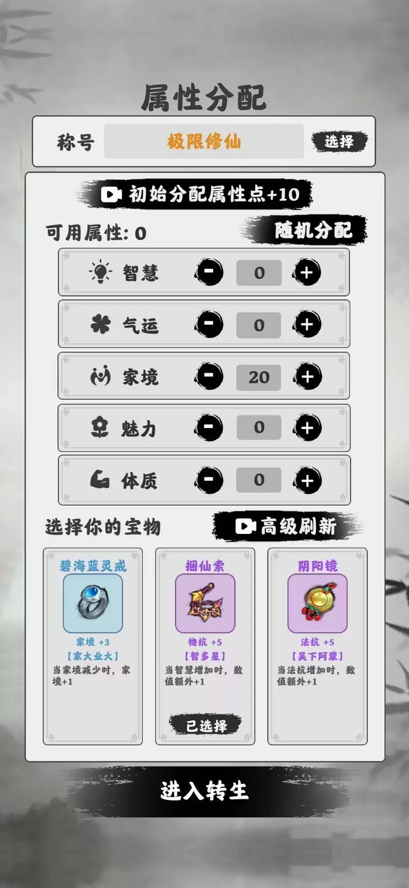 出装这个就得有大讲究了,基本上很多轮回都是败在了出装上,包括我在前一天也是卡死在大乘上,出装我主要分为经验套和防御套,经验套越早出效果越好主要是看前期加点和加成缺啥补啥,别太多也别出太多,不然某年得卖掉还浪费了买卖次数。防御套在寂灭开始就要备齐全了,当然也有大佬对着天劫攻击属性出装的,这个就得计算了,太烧脑不够娱乐我选择全都要(握拳)。
