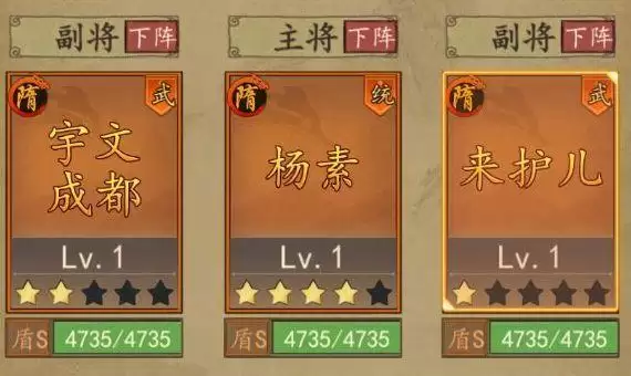 宇文成都主输出,来护儿保核,杨素辅助。从技能上来看这一队除了缺点控制并没有什么硬伤。但是宇文成都作为主c,武力成长却较低,反而是来护儿都武力加成较高(但其技能伤害系数又很低)。而且目前并没有特别契合这个组合的技能。再加之来护儿的护主不能防住当前主流的爆头骑,使该组合的出场率大大降低。