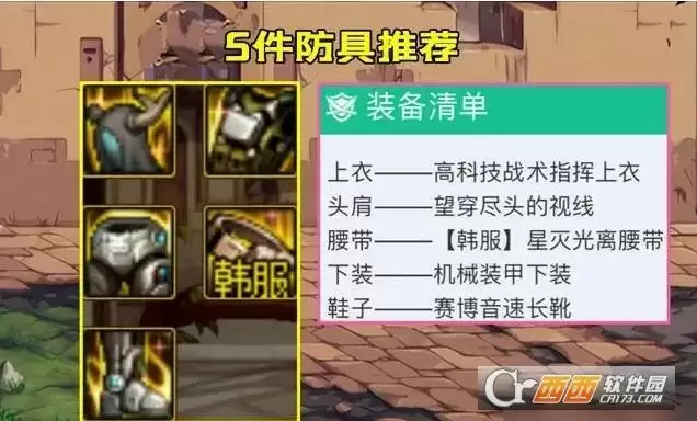 防具5件:望穿尽头的视线/灵巧的支配者护肩、高科技战术指挥上衣(伤害更高)/暗影流光长袍(CD和破韧更强)、机械装甲下装、星灭光离腰带(攻速+15%)、赛博音速长靴。
