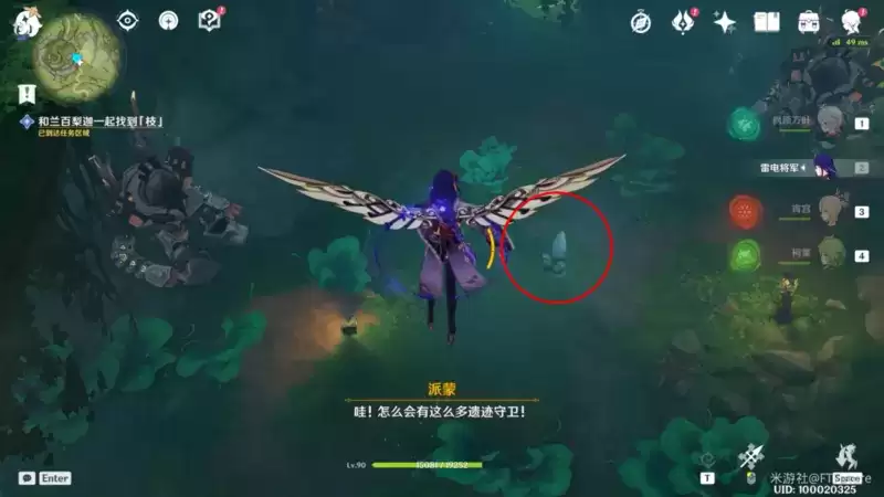 这里我们总共需要击败3个遗迹守卫,地图上会标注位置,都很好找,跟着一路过去击败三个位置的遗迹守卫即可。兰百梨迦会在遗迹守卫旁边等我们,进入战斗时还会使用草元素攻击来和我们一同战斗。