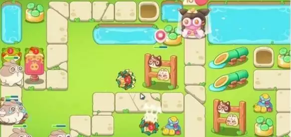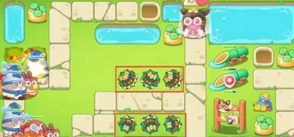 第四波开始出现龙舟兔,我们需要在中场如图所示放满多重箭,这样保证我们火力充足的同时又可以攻击右场的障碍物。