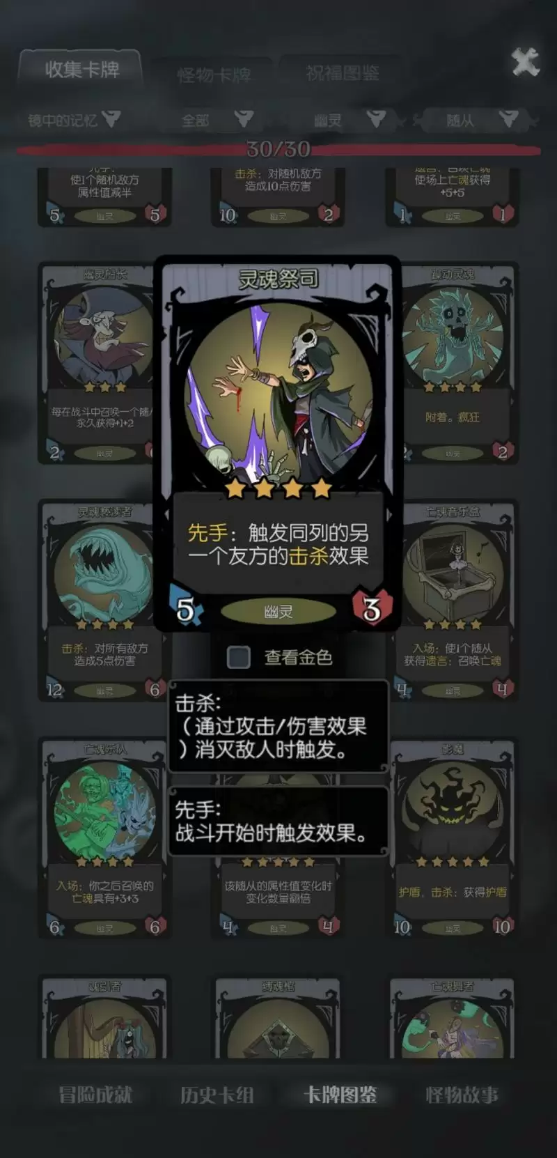 中期4-5级只需要拿灵魂亵渎者和灵魂祭祀两个随从,最好都巨大化升级。尤其是灵魂祭祀,巨大化升级前只能触发一个随从,升级后前排三个都能触发,是核心中的核心。同时期记得拿一些强化效果的装备,不然击杀效果伤害会低很多。