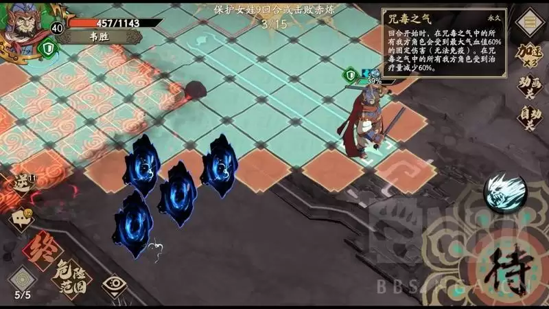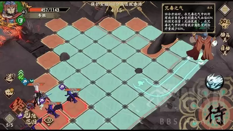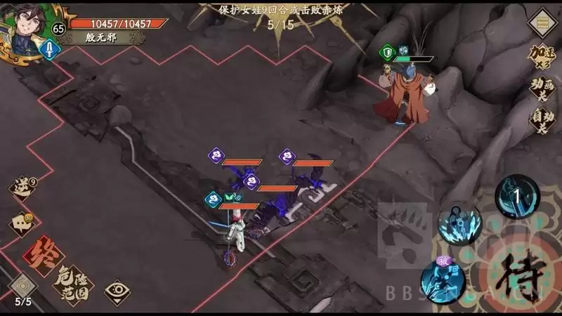 第四回合赤炼出现时,炮灰正好能走到地图最右下角,若此回合大部队离赤炼足够远,赤炼和三只敢死鸟都会去找炮灰,且这一回合赤炼正好差一格打到炮灰。
