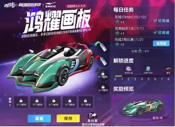 同时,为了让玩家不仅是在穿着上体验国潮文化,而是能更加深入地感受国潮文化,《QQ飞车手游》的“星创·鸿”飞车获取任务还加入了DIY创作环节,让玩家可以自由尝试改变飞车的配色,设计出属于自己的国潮风格飞车。