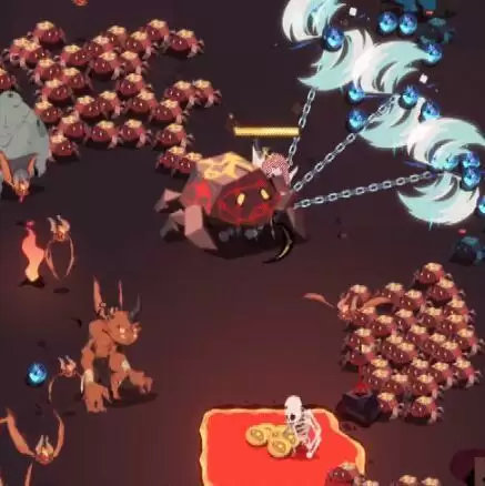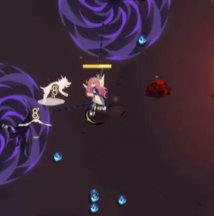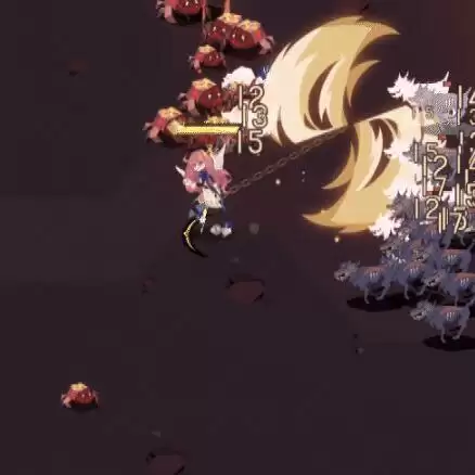 效果:镰刀颜色为紫色,随机挥出一道较大、伤害和飞行速度略低镰刀,碰到屏幕边缘/障碍/其他子弹是会触发反弹效果,反弹可提升镰刀飞行速度,还附带轻微易伤效果。