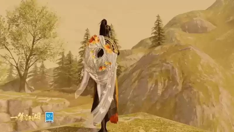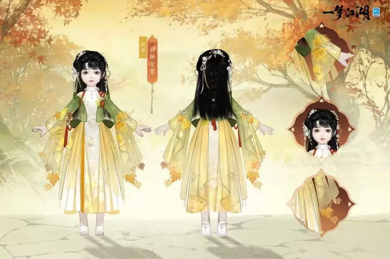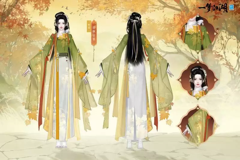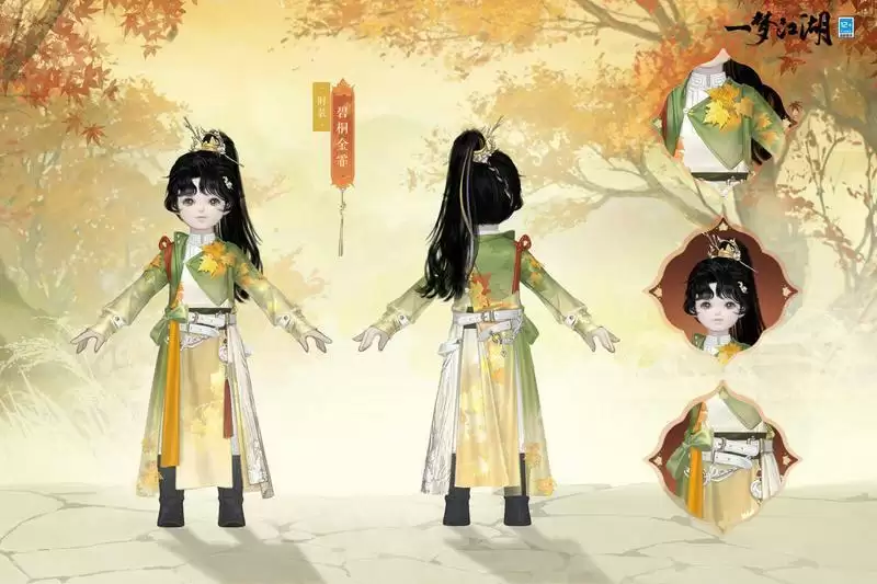 一梦江湖全新时装·碧桐金霏以最能代表秋季的金色与梧桐树间的碧色为主色调,整套时装采用双色交融渐变的设计,仿若初秋的阳光散落在梧桐树金黄与碧绿相间的枝头。时装·碧桐金霏以梧桐叶与枝干为元素制成精美装饰,在白色内衬之间缀满精致的花纹刺绣,并以浅金丝线点缀,给人以浓浓的秋日氛围感。