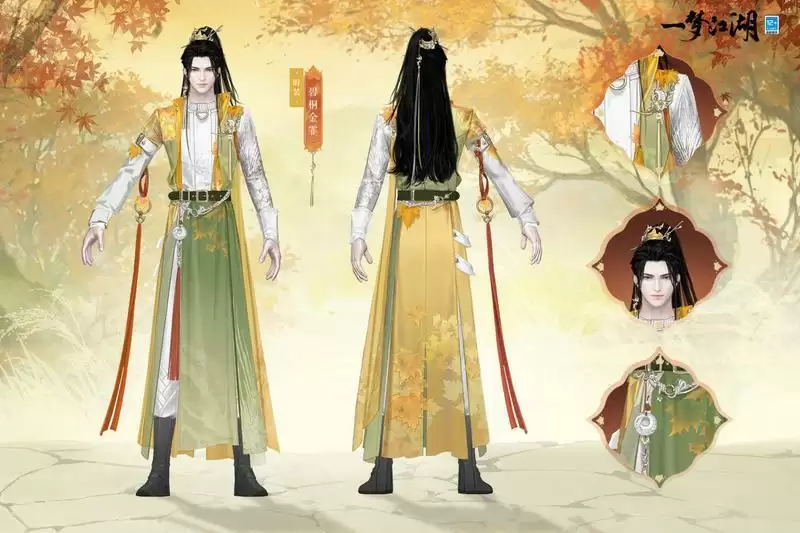 少侠以浅金发冠搭配秋枝发簪,俊秀不凡。黄绿渐变的立领外衫间点缀上金橙色梧桐叶刺绣,月出梧桐样式的胸针别在襟前,衬得他们潇洒不羁,文雅出尘。