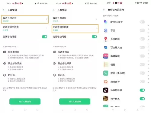 与此同时,OPPO还推出了儿童空间、家庭空间等管控措施,与防沉迷管控系统相互协作,保证未成年人可以拥有一个健康的手游空间。在儿童空间、家庭空间中,家长可以设置手机使用时长,可访问的应用,还能对手机联网情况进行控制,也能防止话费损失,禁止未成年人修改系统设置,更可以查看孩子7天内应用的使用情况。家长只需打开手机设置--隐私--儿童空间--设置相关软件及使用时间--进入儿童空间即可完成设置。