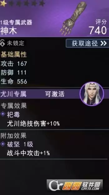 尤川专属武器绝品武器:天工玄铁臂。专属效果祀毒(绝技伤害+15%),附加效果破坚(战斗中攻击+2%)