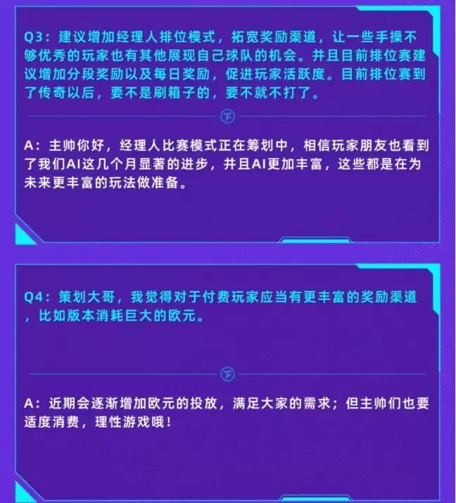 Q3:建议增加经理人排位模式,拓宽奖励渠道,让一些手操不够优秀的玩家也有其他展现自己球队的机会。并且目前排位赛建议增加分段奖励以及每日奖励,促进玩家活跃度。目前排位赛到了传奇以后,要不是刷箱子的,要不就不打了。