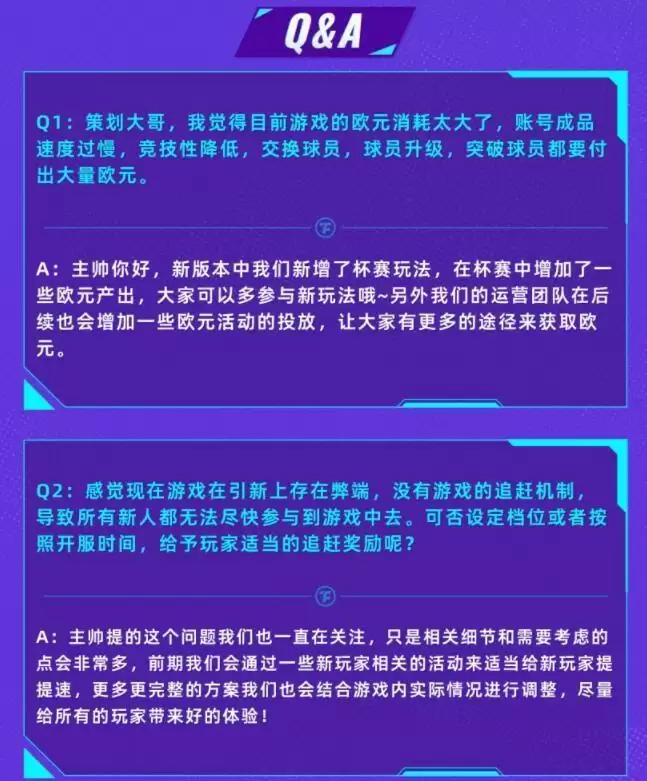 Q1:策划大哥,我觉得目前游戏的欧元消耗太大了,账号成品速度过慢,竞技性降低,交换球员,球员升级,突破球员都要付出大量欧元。