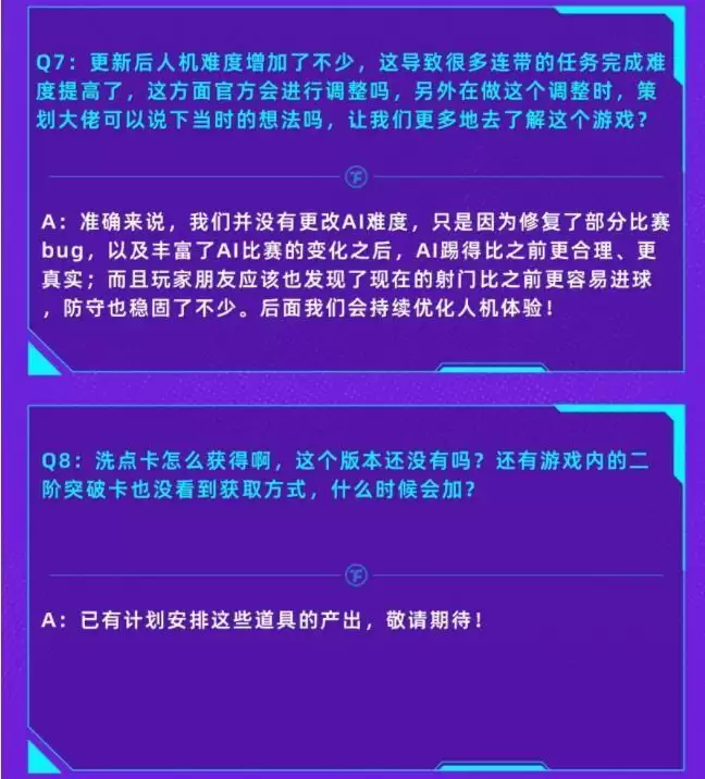 A:准确来说,我们并没有更改AI难度,只是因为修复了部分比赛bug,以及丰富了AI比赛的变化之后,AI踢得比之前更合理、更真实;而且玩家朋友应该也发现了现在的射门比之前更容易进球,防守也稳固了不少。后面我们会持续优化人机体验!