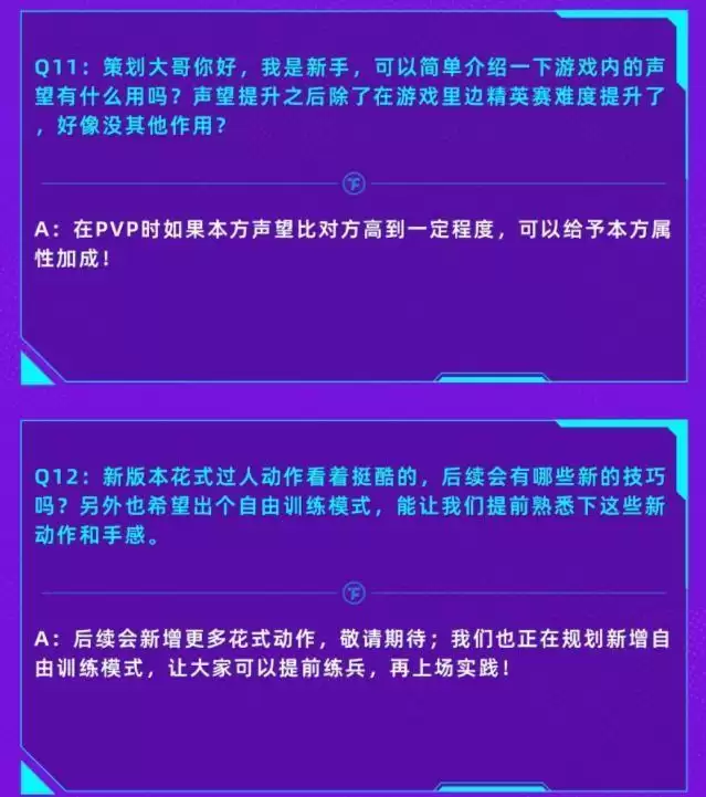 Q12:新版本花式过人动作看着挺酷的,后续会有哪些新的技巧吗?另外也希望出个自由训练模式,能让我们提前熟悉下这些新动作和手感。