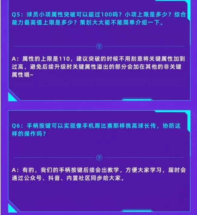 Q5:球员小项属性突破可以超过100吗?小项上限是多少?综合能力最高值上限是多少?策划大大能不能简单介绍一下。