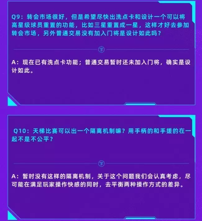 Q9:转会市场很好,但是希望尽快出洗点卡和设计一个可以将高星级球员重置的功能,比如三星重置成一星,这样才好去参加转会市场,另外普通交易没有加入门将是设计如此吗?