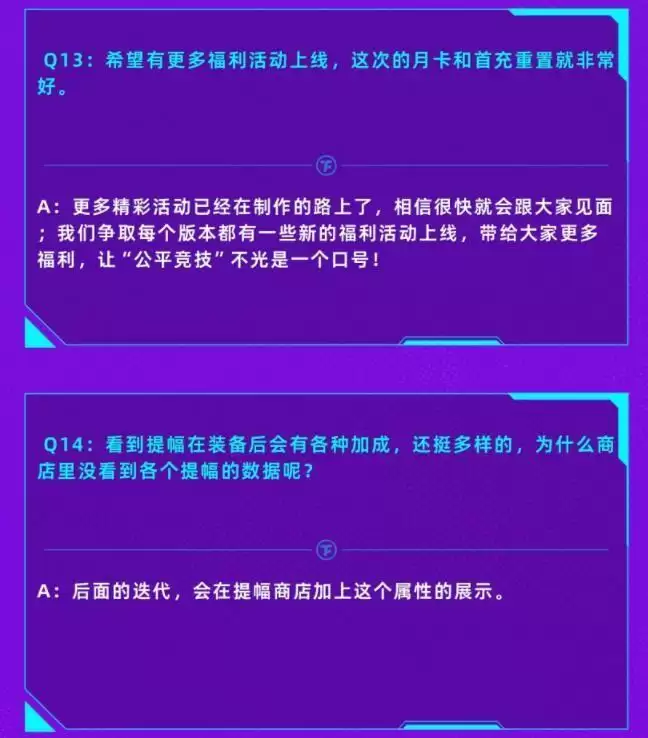 A:更多精彩活动已经在制作的路上了,相信很快就会跟大家见面;我们争取每个版本都有一些新的福利活动上线,带给大家更多福利,让“公平竞技”不光是一个口号!