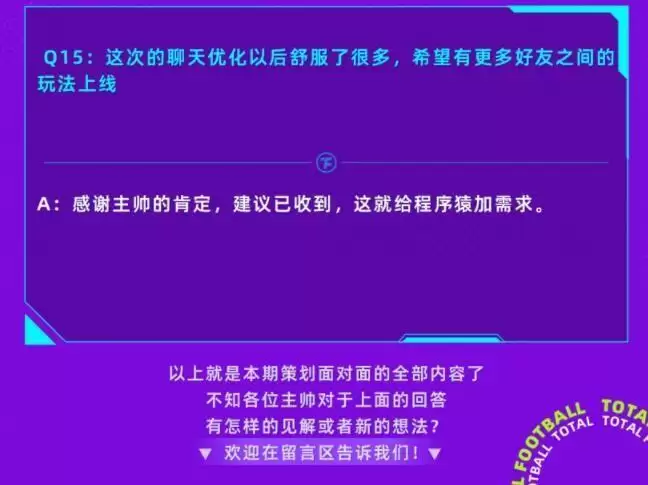 Q15:这次的聊天优化以后舒服了很多,希望有更多好友之间的玩法上线