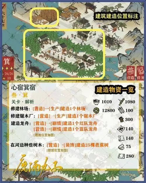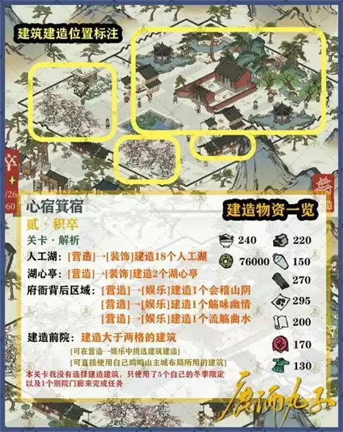 1.心宿箕宿关卡中需要繁荣度累计可利用鸡鸣山布局所用的娱乐建筑摆放在关卡中,待任务完成亦可回收利用。