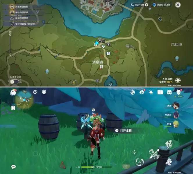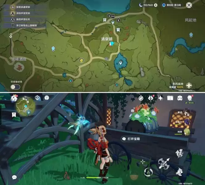 来到清泉镇传送点西北侧,前往如图位置,在舞台后取得宝箱一。