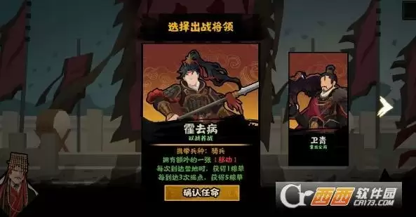 霍去病自带骑兵,开局1级骑兵,buff挺强的,每次到营地+1粮草,每经过3次据点时+5粮草