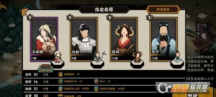 民生:王昭君/巴清,羲和这个没用了,因为后面需要探查,而且10粮草消耗太大,可以用王昭君或者巴清替换