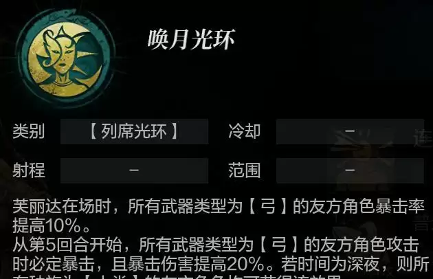 唤月者的列席光环,能够提升弓类友方的暴击率,使得原本暴击率就相对偏高的唤月者以及其他弓类友军的暴击概率获得额外提升。