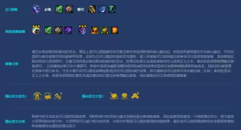 得益于新版本对于该阵容体系中的加强,五玉龙羁绊效果可以提供30%的攻速加成,同时二星石傲玉的技能伤害也获得了加强以及赛芬的技能无视护甲加强到了33%,不难看出这套幽影玉龙双C是新版本中的上分答案;虽然版本对于阵容中提供了较大的加强,但是阵容中的输出都是偏向于物理且攻击距离较短,在后期会显得非常笨重,因此想要吃鸡还是需要在强化符文中获得更高的加持