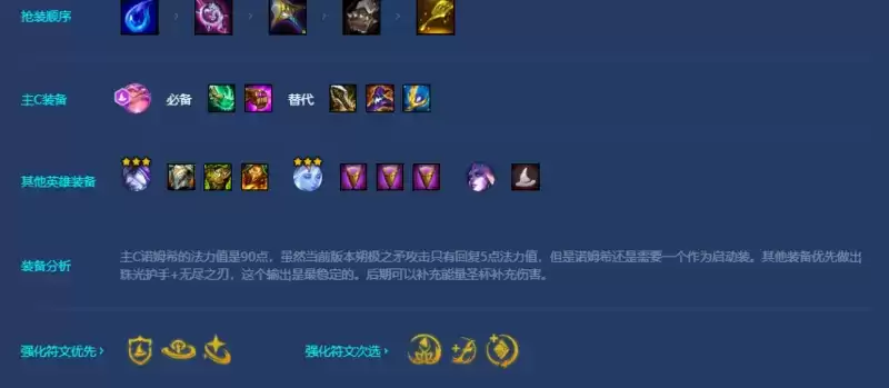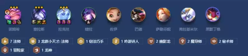 这是一套运营阵容,阵容羁绊大于弈子等级。因此优先运营拉8人口,后续再慢追3星诺姆希,后期的上限就是在于高法师和诺姆希的3星上。因此前期运营非常重要。