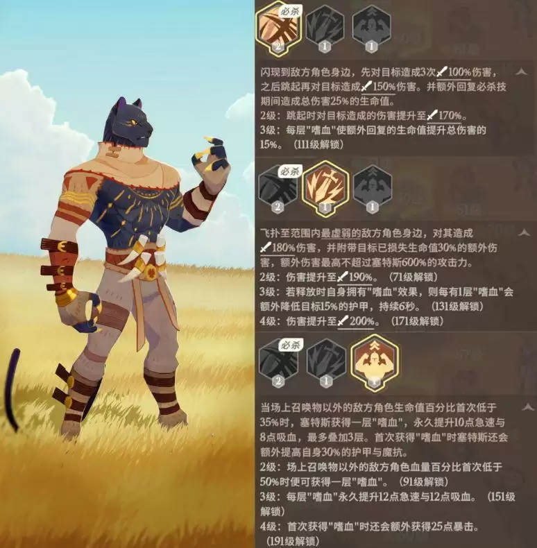 豹子的恐怖程度是每个参与一测的人都体会到的,整个游戏最强单兵作战能力,强大的切后和续航能力即使是队友全灭,豹子依然可以一打五。虽然在后排较多的情况下剑圣的切后输出能力要大于豹子,但是豹子的优点就在于他越打越猛,自带的吸血buff经常性的两巴掌就可以让残血的自己回满血量,且豹子的梦境体验远远大于剑圣,又由于一测蛮子阵营的角色强度都不低(第一奶爸玛卡巴卡,无敌狮子),所以也可以更容易吃到阵营加成。唯一缺点是金卡,本体兑换太贵,升品质难