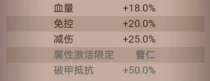 减伤: 25%,安放在曹仁身上,会激活限定属性,破甲抵抗50%