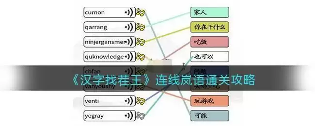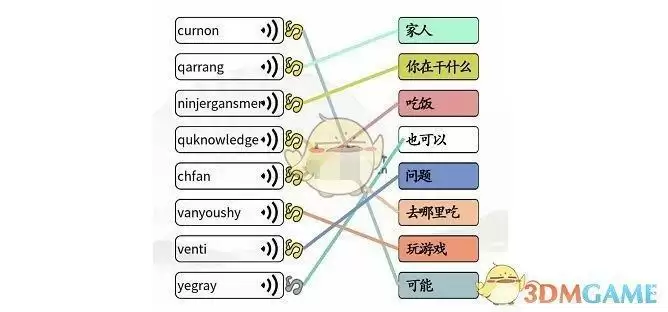 2、对岚语不了解的玩家,可以通过首字母和基本读音进行猜测。比如ninjergansmer 读起来就像是你在干什么,chfan就是吃饭,venti读起来也很像问题,按照这种思路,全部连接完成即可