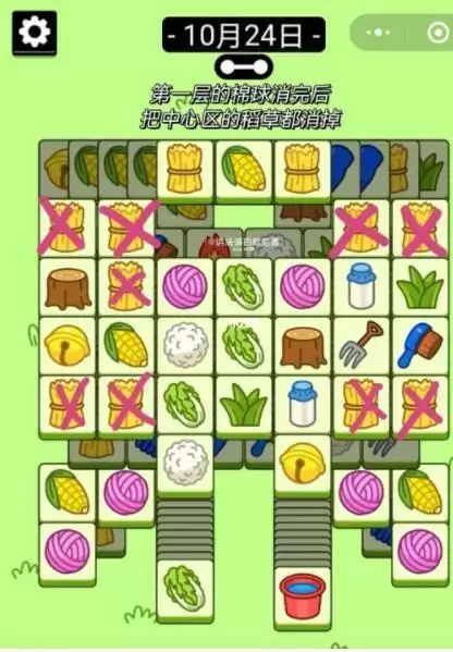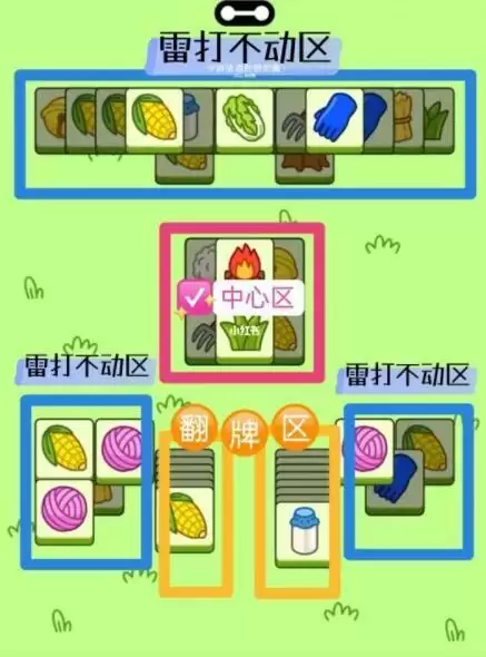 1、前半段(不用道具):中心区的紫色毛球和稻草!!>中心区内部消除>翻牌区+中心区>中心区+雷打不动区重叠部分