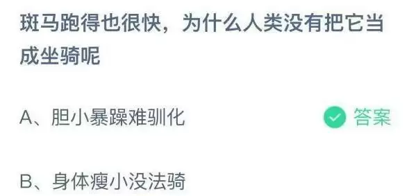 斑马跑得也很快,为什么人类没有把它当成坐骑呢?正确答案:胆小暴躁难驯化。这是支付宝蚂蚁庄园小课堂2022年10月25日问题之一,答对后能领取小鸡饲料180克,下面小编就给大家带来了支付宝答题10月25日答案2022蚂蚁庄园,还不清楚答案的朋友不妨随三大妈小编一起看看吧。