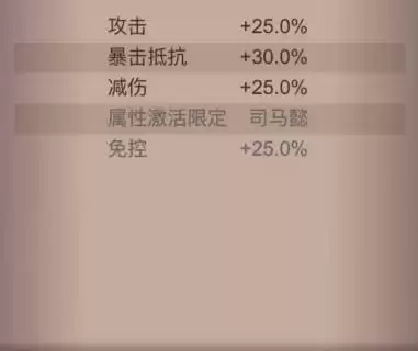 属性:攻击增加25%,暴击抵抗增加30%,减伤增加25%,安放在司马懿身上后,激活限定属性,免控增加25%。