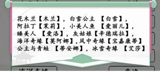 2、这一关大家可以先连接熟悉的,比如白雪公主白雪,小美人鱼爱丽儿,花木兰木兰等,然后再将不熟悉的连接