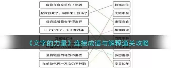 文字的力量是抖音上目前很火的精彩益智烧脑解谜闯关游戏,游戏中连接成语与解释怎么过?这一关成语有点误导小朋友的嫌疑,今天小编就给大家带来了抖音小游戏《文字的力量》连接成语与解释通关攻略详解,希望对大家有帮助哦!