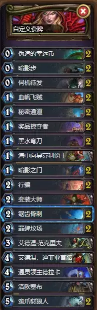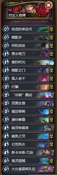 打法介绍:由于癫狂公爵的削弱,组合技卡组又能玩了,本套卡组通过前期的疯狂过牌来找到key牌,鲨鱼之灵、刀油、狐人老千加上暗影步的组合可以让你一回合打出多张牌,最后刀油鬼灵斩杀对方。