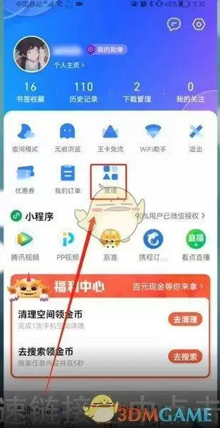 2、回到主页面,选择我的,在快速链接之中点击管理。